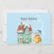 Whimsikischer Tonschneemann und Hütte auf hellblauem Hintergrund mit magischer Schneeschwale. Der Text "Happy Holidays" im modernen Schriftart ist benutzerdefinierbar