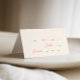 Whimsikale, schwindelerregende grüne und rosa Platzkarte mit einem lässigen, handgeschriebenen Schriftart, der die Spannung und Freude der Veranstaltung perfekt einfängt. Die Platzkarten können individuell an die Tischnummer und das Essen Ihrer Gäste angepasst werden.