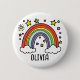 Niedliche, skurrile Abbildung eines farbigen Regenbogens mit flauschigen weißen Wolken, einer gelben Sonne, Sternen, Herzen und Punkten. Unten ist eine Vorlage, um Ihren Namen oder anderen Text zu personalisieren hinzuzufügen.