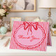 This whimsical thank you card features a juicy red watercolor bow and a scalloped oval frame against a fun red and pink striped background. Perfect for a wedding with a preppy or Valentines aesthetic, this charming design provides a sweet, hand-painted look for your special celebration. Created by Simply Farmhouse Press.