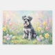 Celebrate the joy of spring with this charming Schnauzer nestled among blooming tulips, daffodils, and colorful Easter eggs in a dreamy pastel meadow.