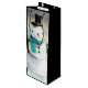 Weingeschenktasche mit niedlichem zeichn mit einem Schneemann mit coolem Hut und Schal. Im Hintergrund gibt es eine Reihe schneebedeckter Kiefernbäume.