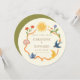 The round shape and watercolor illustration create a unique artistic feel, setting the tone for a joyful celebration.