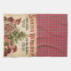 Das Whimsical Küchentuch bietet eine Vintage Santa's Workshop-Szene mit Elfen, Lebkuchenhaus und Weihnachtsbaum. Karierter Hintergrund.