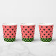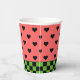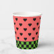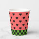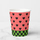 Whimsical Papier Becher mit Wassermelone rosa und schwarzen Herzen Muster mit dunkelgrünen Schachbrett Boden Rand.