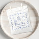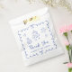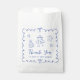 Niedliche und sonderbare Gefälligkeitstaschen für Ihre Babydusche mit einem blauen, mit Bogen verzierten Rahmen, von der Hand gezeichnet Klangbilder, Sterne, Kuchen- und Kinderzimmer-Dekor und "Danke" in einem lustigen, spielerischen blauen Drehbuch.