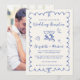 Romantic light cream wedding reception save the date featuring a french blue wavy frame adorned with coquette bows, whimsical hand drawn illustrations of a heart, stars and wine glasses, and "Wedding Reception" and the names of the bride and groom in a fun, playful blue script. Add your photo on the back.