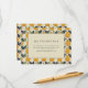 This wedding enclosure card features a charming design with a repeating pattern of stylized pears and leaves in warm yellow-orange hues against a light beige background. The central cream-colored box, framed by a double border, contains elegant serif typography that guides guests to find more details online. The playful yet sophisticated layout combines organic shapes and clean lines, creating a welcoming and cheerful atmosphere perfect for celebrating your special day.