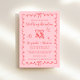 Trendige retro-inspirierte rosa und rote Hochzeitsempfang Save-the-Date-Karte mit welligem Rahmen, verziert mit Koketten-Schleifen, wunderlichen handgezeichneten Illustrationen eines Herzens, Sternen und Weingläsern und "Hochzeitsempfang" und den Namen der Braut und des Bräutigams in einer lustigen, spielerischen Schrift. Ihr Foto füllt die Rückseite der Einladung.
