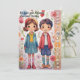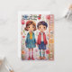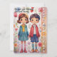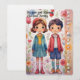 Eine Grußkarte zum Muttertag, die eine skurrile und farbenfrohe Abbildung eines jungen Mädchens und seines Bruders stehend nebeneinander in einer lebhaften, stilvollen Gartenlandschaft darstellt. Zwei kleine glückliche lächelnde Kinder mit großen Augen und farbenfrohen Kleider halten Hände. Sie tragen moderne Kleidung mit fröhlichen Pastellfarben und bunten gestreiften Socken. Der Boden unter den Füßen ist mit stilisiertem grünem Blattwerk und farbenfrohen Blume in fröhlichen und pastellfarbenen Tönen dargestellt, was der Abbildung eine süße Touch verleiht. Die Farbtöne sind süß und pastellfarben und tragen zur Freundlichkeit und Liebe des Muttertags bei. Der Gesamtstil des Kunstwerks erinnert an die Illustrationen von Kinderbüchern mit ihren sanften Linien, den süßen Farben und den liebenswerten Charakteren. Es vermittelt ein Gefühl von Liebe, Wärme und kindlicher Unschuld, perfekt geeignet für einen Muttertagsgruß. Alle Texte sind anpassbar, glücklicher Muttertag wird vertikal auf der Seite geschrieben, für eine moderne Touch, Personalisieren Sie sie, damit diese Karte wirklich Ihre eigene ist, um Ihre ganz besondere Bindung an Ihre Mutter zu zeigen. Der Rücken ist leer verlassen, Sie können dann mit dem Zazzle-Editor oder von Hand eigene Wörter schreiben.
