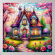 Eine lebendige Szene einer skurrilen Hütte, umgeben von blühenden Blume, mit Buntglasfenstern und aufwändigen Details, die eine magische Atmosphäre schaffen.