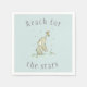 Ein winziger Hase bekommt Hilfe von ihrem Elefanten Freund, wenn sie nach den Sternen greifen. Weiche handgezeichnete Abbildung mit Text in grauem Schriftart auf hellblauem Hintergrund.