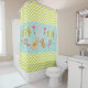 Ein hübscher, weißer Duschvorhang mit Vögeln, Blätter, Herzen und Blume auf einem Aquarell mit einem breiten oberen und unteren Rand von Zickzack, grünen und weißen Streifen.