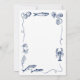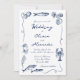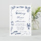 Diese weiße und navyblaue handgezeichnete Küsten-Hochzeitseinladung ist perfekt für den aktuellen Fischer-Look und enthält einen verspielten Doodle-Rahmen mit handgezeichneten Muscheln, Fischen und Meereslebewesen.