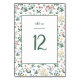 Hochzeitskarte in mehreren Tischnummern mit Blumenrahmen und Grüntext mit handgeschriebenem Schriftart