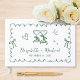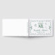 Romantisches Hochzeitsgästebuch mit grünem, wellenförmigem Rahmen, verziert mit Koketten-Schleifen, wunderlichen Handzeichnungen von Herzen, Sternen und Weingläsern sowie den Namen der Braut und des Bräutigams in einer spielerischen grünen Schrift.