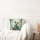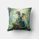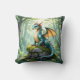 Drachenthemenwerfen Kissen für Jungenzimmer. Ein skurriler Drache, der in einem detaillierten Aquarellbild dargestellt wird, erhebt sich auf einer moosbedeckten alten Steinruine. Sonnenlicht filtert durch die dichte Baumkronen und beleuchtet Staubmotten, die in der Luft tanzen. Die Waage des Drachen schimmert mit schillernden Tönen, und seine Augen halten eine sanfte, wissende, lustige Fantasiekunst. Niedlich für den Raum eines Jungen.
