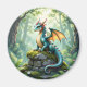 Dragon-Magnet. Ein skurriler Drache, der in einem detaillierten Aquarellbild dargestellt wird, erhebt sich auf einer moosbedeckten alten Steinruine. Sonnenlicht filtert durch die dichte Baumkronen und beleuchtet Staubmotten, die in der Luft tanzen. Die Waage des Drachen schimmert mit schillernden Tönen, und seine Augen halten eine sanfte, wissende, lustige Fantasiekunst. Niedlich für den Raum eines Jungen.