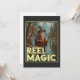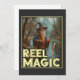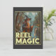 Dieses skurrile Bild zeigt einen Zauberer, der von einem Fluss in einem bewaldeten Gebiet stehend ist und eine Angelrute mit einem Fisch in Richtung der Linie hält. In traditioneller Zauberkunst gekleidet, inklusive einem langen Gewand und einem spitzen Hut, verzaubert der Zauberer beim Angeln. Der Hintergrund mit Bäumen und Bergen schafft eine mystische und ruhige Atmosphäre. Der Text "REEL MAGIC" wird am unteren Bildrand sichtbar angezeigt und fügt der Szene eine humorvolle und magische Touch hinzu.