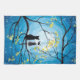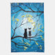 Zwei Katzen sitzen auf einem Ast und schauen den Vollmond mit einem blauen Himmel voller Sterne an. Die Zweige der Bäume, die sie umgeben, sind mit kleinen gelben Blumen geschmückt. Schwarze Tuxedokatze und eine gepunktete Katze in zwei Farben. Original Moderne Akrylmalerei von Donna Leger. Alle Rechte vorbehalten. ©irony Designs