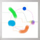 Abstrakte Formen und lebhafte Farben sind auf einem schlichten, weißen Hintergrund angeordnet, der Kreise, Linien und Bio Formen in den Farben Grün, Blau und Orange umfasst. Die Komposition schafft ein spielerisches und dynamisches visuelles Interesse.