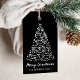 Geben Sie Ihren Urlaubspaketen ein elegantes Upgrade mit diesen personalisierten Weihnachtsgeschenktafeln, die einen skurrilen, von Hand gezeichnet Baum mit Bögen auf schwarzem Hintergrund zeigen. Die Worte "Frohe Weihnachten" erscheinen in spielerisch weißer Schrift mit Platz für deinen Familiennamen darunter. Eine moderne Touch für Weihnachtsgeschenke und Gastgeschenke.