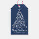 Mit diesen personalisierten Weihnachtsgeschenktafeln, die mit einem knisternden, von Hand gezeichnet Weihnachtsbaum mit Bögen auf klassischem marinischem Hintergrund versehen sind, verleihen Sie Ihrer Verpackung eine raffinierte Note. "Frohe Weihnachten" wird in handgeschriebenem weißen Skript über Ihrem Familiennamen hervorgehoben. Eine elegante Art, Weihnachtsgeschenke und Feiertagsvorzüge anzuziehen.
