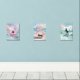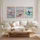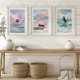 Diese bezaubernde Kollektion von drei Aquarelldrucken verleiht Ihrem Zuhause den wahnsinnigen Küstenstreifen. Das erste Kunstwerk zeigt eine schwarze Katze, die spielerisch im Ozean auf einem pastellfarbenen Flamingo Float schwebt und übergroße Sonnenbrillen gegen traumhafte Pastellwellen trägt. Die zweite zeigt eine Katze, die sich bequem in einem Muschelstuhl unter einem pastellfarbenen Sonnenschirm mit sanften Ozeanwellen und weichem Sand unterhält und den Blick aufs Meer vervollständigt. Der dritte Druck fängt eine Katze ein, die auf einem pastellfarbenen Surfbrett in türkisfarbenen Wellen balanciert, was eine ruhige, aber leichtere Szene schafft. Jedes Stück ist in zarten Pinselstrichen mit sanften Pastelltönen gestrichen und verleiht der Kollektion einen zusammenhängenden und beruhigenden Look.