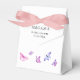 Whimsy Schmetterling Thema Brautparty Gefälligkeitsbox mit Aquarellbild von rosa und lila Schmetterlingen.