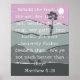 Matthew 6:26 - "Seht die Vögel der Luft: Denn sie säen nicht, ernten sie auch nicht, noch sammeln sie sich in Scheunen; doch euer himmlischer Vater ernährt sie. Bist du nicht viel besser als sie?" Whimsikales Pastellposter eines Mädchens, das in der Luft mit Ballons, Bergen, Mondschein, Rosa und Grau-Design hochfliegt. Originelle Kunst entworfen von Suzanne Hein Kreationen.