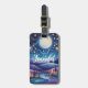 Ein Gepäckanhänger mit einer schönen Abbildung. Whimsical und fantasievoll vibe. Ein großer leuchtender Mond mit Sternen überall. Hängend über eine schöne Landschaft von Bäumen, Bergen und einem gewundenen Fluss. Phantastisches magisches mystisches Flair.