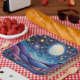 Papier Teller mit einer schönen Abbildung. Whimsical und fantasievoll vibe. Ein großer leuchtender Mond mit Sternen überall. Hängend über eine schöne Landschaft von Bäumen, Bergen und einem gewundenen Fluss. Phantastisches magisches mystisches Flair.