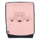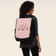 Ein Rucksack mit einem zeichn eines niedlichen rosa Schweinegesichts. Tragen einer schwarzen Bogen-Krawatte. Von seinen schwarzen Hühnchen erheben und über dich gucken. Niedlicher und skurriler zeichn. Set auf einem rosa Hintergrund mit einigen verblassten Herzen hier und da.