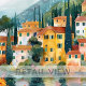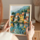 Mit diesem skurrilen Kunstdruck mit einem farbenprächtigen Seendorf inmitten von Zypressen und Wildblumen lassen Sie Ihre Zuhause mit europäischem Charme aufwarten. Mit warmen Gelb- und Terrakotta-Gebäude, die sich in ruhigen blauen Gewässern widerspiegeln, erinnert diese Szene an die Romantik der italienischen Küste oder an einen friedlichen mediterranen Urlaub. Ideal für Reisende, Cottage-Fans oder für alle, die sich einen fröhlichen Blumenstrauß und landschaftliche Ruhe an ihren Wänden wünschen.