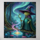 This whimsical poster features a frog wizard in a moonlit forest casts a glowing heart spell over an enchanted pond, aurora swirling, mystic staff and lily pads.