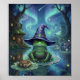 This whimsical poster features a wizard frog on a lily pad wearing a starry hat beside a magic book, glowing aurora over a moonlit fairy pond with cottage and mushrooms.