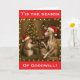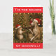 If you own or love a Whippet or are a dog lover I'm sure you'll know the penchant that Whippets have for squirrels! Our Whippet goes from zero to 100 if he sees or gets wind of one. Here they are toasting their Christmas truce in this Christmas holiday greetings card. The Whippet dog and the squirrel are both sitting in armchairs opposite one another with a glass of red wine which they're making a toast to one another with. A Christmas tree is behind them with twinkling light.