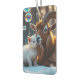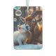Eine sanfte, langhornige Ziege teilt sich einen zarten Moment mit einem kleinen weißen Kätzchen in einem schneebedeckten Wald, umgeben von schimmernden Blasen. Eine schöne Darstellung unerwarteter Freundschaft und Wintermagie.