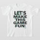 The T-shirt showcases a white and green line art drawing of a character that appears to be a robot or a stylized human figure. The character is depicted in a dynamic pose, with one arm extended forward and the other bent at the elbow. The design is overlaid on bold black text that reads "LET'S MAKE THIS GAME FUN!" The combination of the intricate line art and the eye-catching text creates a visually appealing and fun design.