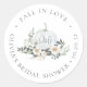 Herbst in Liebe mit diesem ätherischen botanischen Design für Herbst-Brautpartys, Probe-Dinners, Hochzeiten oder Verlobungen. Das elegante Design besticht durch einen weißen Wasserfarbenkürbis, der mit den Initialen des Paares beschriftet und von weißen Blume, grünem Blattwerk und Eukalyptus-Blätter flankiert ist. Personalisieren Sie mit zwei Zeilen benutzerdefinierten Text in einem abgerundeten runden Layout.