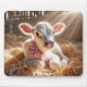 Ein junges Kalb mit einem rosa Bug, der um den Hals gebunden ist, legt auf einem Strohbett in einem Stall mit Sonnenbänken, die glänzen
