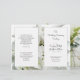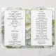 Weißes Hochzeitsprogramm am Strand in zwei Hälften. Der schwarze Text ist auf beiden Seiten leicht anzupassen und entspricht vier Seiten im Programm. Weiße Paneele auf weißem, blumengeschmückten Hintergrund geben dem Design ein zweidimensionales Aussehen. An der Vorderseite ist ein großer, weißer Seestern/Seestern zwischen den Blütenblättern der Blume versteckt. (Die Hintergrundbilder können auch für ein schlichtes, schwarz-weißes Programm entfernt werden.) Fügen Sie die Schrift (Liebe ist geduldig - oder Ihre Wahl) und eine Nachricht vom Paar auf der Rückseite ein. Diese Vorlage eignet sich für eine längere Zeremonie, die viel Text benötigt, kann aber auch mit weniger Text verwendet werden. Falten Sie nach dem Kauf.