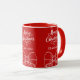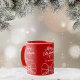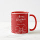 Roter Hintergrund, weißer Text und Bows Feiern Sie die Saison mit unserer modernen roten Frohe Weihnachtsfeier Tasse Personalize und fügen Sie Ihren Namen.
