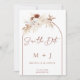 Die White Brown Boho Floral Arch Save the Date Card Moderne Minimalistin rette unsere Dattelkarte mit Terrakotta Bogen und Blumenarrangements in Braun, Weiß und Naturtönen. Dieses Design umfasst auch die Paarinitialen, die moderne Kalligraphie-Bildkopie und ein Foto des Paares auf der Rückseite.