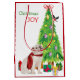 Auf jeder Seite dieser Holiday Geschenktasche trägt ein weißer Bulldog einen roten Schal, während er einen Stiervogel auf dem Weihnachtsbaum beobachtet. Rund um den Hund herum gibt es leicht gewickelte Geschenkpakete. Der rote und grüne Text sagt "Christmas JOY".