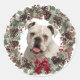 Schauen Sie sich dieses wunderschöne, weiße Bulldoggesicht an, gerahmt von einem hübschen Aquarellkiefer und einem roten Beerenfeuer. Das Hundebild ist in der Mitte auf einem weißen Hintergrund. Ein glänzender roter Bogen verleiht dem Kranz ein bisschen Weihnachtsfunkel. Ideal für Ihre Urlaubspakete oder Korrespondenz.
