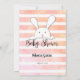 Genießen Sie dieses Baby Names Baby Duschspiel auf weicher, korallen und weißer Wasserfarbe Streifen Hintergrund. Niedliches, weißes, sonniges Kaninchen hinten mit Vorlagen, die für Sie geschaffen wurden.