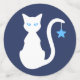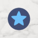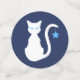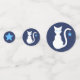 Festliche Konfetti zu Weihnachten. Groß und mittelgroß hat eine weiße Katze mit einem eisblauen Stern, der von ihrem Schwanz hängt. Die große Größe hat "Frohe Weihnachten" und Sterne auf einer Seite. Klein hat einen passenden Eisstar. Alle haben einen marineblauen Hintergrund.