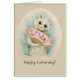 Grußkarte inspiriert von einer Aquarellfarbe des britischen Katzenkünstlers Louis Wain. Das Bild zeigt eine lächelnde weiße Katze, die sich selbst abkühlt (?), mit einem rosa Ventilator, der mit roten Blume verziert ist. Personalisieren Sie die Grußkarte, indem Sie einfach die Beispieltexte eingeben.
