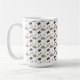 White ceramic mug featuring a playful pattern of postal stamps and envelopes in red, black, and gray, conveying a theme of communication and nostalgia.